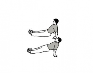 • بدون آنکه زانو و دست ها از زمین جدا شود، قسمت تنه و دست ها را به سمت عقب حرکت دهید.