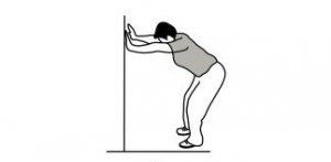 • با فاصله و پشت به دیوار بایستید. در حالی که زانو ها را خم و بالا تنه را به  سمت جلو متمایل کرده اید، کف دست ها را از پشت روی دیوار قرار دهید.